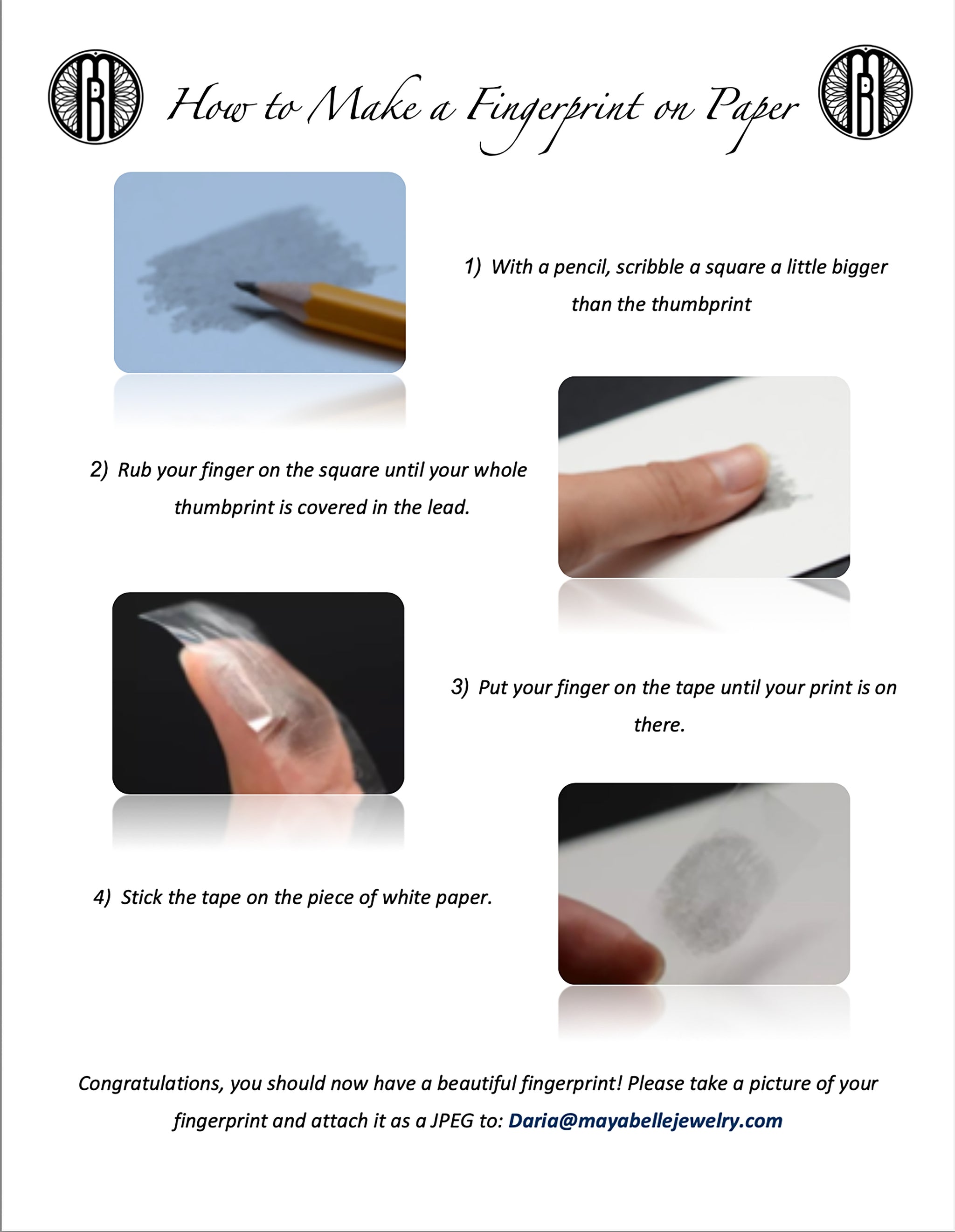 Email or text a photo of your fingerprint and handwriting to daria@mayabellejewelry.com or 215-527-1767. Please include your order number. Tips for taking a good print are shown in the last image. Feel free to send a few, and I'll choose the best one.